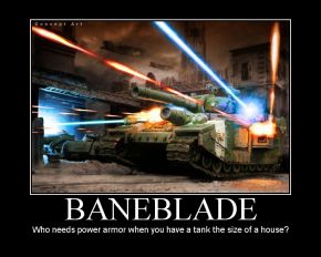 «Разящий клинок», он же банеблядь, он же беня (Baneblade) — Многобашенный сверхтяжелый танк. Самый главный, самый страшный и самый редкий инструмент Имперской Гвардии для жестокого наказания врагов человечества. 316 тонн чистой крутизны. По сути, мамонт-танк сорок второго тысячелетия. В былинные времена считались средними танками и использовались целыми батальонами. Количество версий «Клинка» давно исчисляется десятками, значимые: «Shadowsword» — аццкий титаноубийца с титанической лазпушкой «Вулкан», «Stormblade» — второй титаноубийца с титанической плазмапушкой (бьет по площади, не перегревается) и «Stormhammer» — адская крепость наказаний (в 2 раза больше вооружения чем у «Бени»).