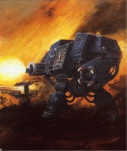 Дредноут, он же дред (Dreadnought) — боевая ходячая машина тотального уничтожения с вмонтированным полумертвым спейсмарином-героем, слишком израненным, чтобы жить, но и слишком ценным, чтобы умереть (даже если от собственно мариноса остался только череп и кусок позвоночника, в дреде выживет). Дредноуты квадратны, неповоротливы, тормознуты от постоянного сна и при этом злы с недосыпа. Отличаются живучестью (тысячи лет) и хранят знания о битвах своего ордена. Ну и плюс являются объектом лютого фапа всего ордена, так как служить Императору и ордену после смерти — розовая мечта любого десантника. Особо престарелых дредноутов зовут Почтенными; отличить сих товарищей можно по старому корпусу — шлем выставлен наружу, ибо вертеть головой таки приятнее, чем смотреть в щелочку (существует холивар по поводу того, находится ли в шлеме голова или там электроника с камерой). Умеют и любят превозмогать, особенно эпичный и меметичный Танкред из ордена Чёрных Храмовников, ухитряющийся геройствовать даже тогда, когда уж и не нужно — и так в ходячем гробике, никаких продвижений по службе уже не будет. Между битвами спят, ибо от такого гроба и спятить можно (что благополучно и сделали хаоситские дреды, обделённые снотворным — у легионов Предателей помещение в дредноут не честь, а наказание). Однажды, в особо пиздецовой ситуации, старейший дред Космоволков Бьорн Разящая рука (Bjorn the Fell-handed) принял командование обороной их крепости и успешно её оборонял до прилета подкреплений. Ибо ему десять тысяч лет и он видел Императора. Опыт соответствующий. Так же, у Кровавых Ангелов на службе имеется модификация «Фуриозо», куда вместо обычного спейсмарина вмонтирован… библиарий! Зрелище четырехметрового адамантиевого кубика, ВНЕЗАПНО воспарившего над полем боя (психосила «Крылья Сангвиния») — явно не для слабонервных.