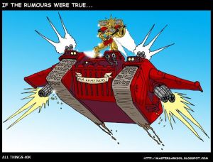«Носорог» (Rhino или RH1 N0) — былинно надежный и неплохо бронированный БТР спейсмаринов и сестрёнок. В оригинале безвредный, возит бравых морпехов/гарных дивчин всюду, куда пролезет. Но сумрачный гений имперских механиков сообразил для него иные применения, и потому машина получила (методом научнотыкового припаивания разной лабуды) множество модификаций: легким движением мехадендрита десантный отсек перепиливается в склад боеприпасов, верхняя дверь заменяется на башни и турели, боковые — на спонсоны, на лобовую броню наваривается пара лишних тонн адмантия и дырки для ружей, в машину впаиваются лазпушки, автопушки, огнеметы и хеви-болтеры, после чего БТР превращаются в средние танки, штурмовые орудия, артиллерию и зенитки. Фактически, это базовое шасси для танков Астартес и Сороритас. При этом, если мариносы просто и без выпендрежа вкручивают оружие, то сестренки обязательно приваривают иконы, матюгальники с гимнами, свечи и молитвенники, а их артиллерия ручной сборки выполняется в виде огромного готичного органа, где каждой ноте соответствует запуск самонаводящейся ракеты.
