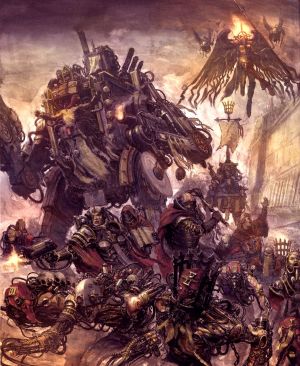 - Хаоситы имеют некоторое количество титанов-еретиков и вяло клепают пополнение с захваченных миров-кузниц. Отличительной чертой титанов Хаоса является то, что их экипаж сплавляется с самим титаном, образуя единую, очень злую и сердитую личность (можно сделать еще круче: титан без экипажа, в который заточили злючего демона). В результате титан получает бонусом какой-нибудь ништяковый бафф от нужного божества. В остальном же практически неотличимы от имперских аналогов, за исключением еретических оригинальных разработок типа кхорнатского трактора или слаанешитского Поработителя с клешнями и хвостом.