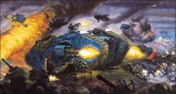 Лэндрейдер (изначально Land’s Raider — Рейдер Лэнда, или Рейдер им. Лэнда) — тяжёлый БТР/БМП/БМД, на котором разъезжают спейсмарины. Укомплектован очень качественным Духом Машины, способным даже самостоятельно что-нибудь навоевать. Своего рода вархаммеровский пативэн, поскольку любой еретик и предатель со страхом ожидает неизбежного приезда к себе ЛР с толпой злых спейсмаринов. Формально является средством доставки мариносов (или термосов) на место, причем крайне нетребователен к маршруту (если ворот нет, ЛР их быстро сделает), но на деле обладает солидной огневой мощью, так что вреда наносит едва ли не больше, чем все его пассажиры вместе взятые. К дизайну вундерпанцера изрядно приложился техномаг Архан Лэнд (Arkhan Land), удачно вернувшийся из крестового похода с планами данной техники (в девичестве бывшей сельскохозяйственным снегоуборочным комбайном для полива зерна) и решивший, что её дизайн морально устарел со времён Тёмной Эры Технологий. Допилил от себя немного лазпушек, ракетных установок, болтеров и штурмовых пушек. Вышла неплохая вундервафля, отличающаяся запредельной прочностью, приличными огневой мощью и вместимостью и даже небольшой ценой (впрочем, просирание исходных чертежей, усложнившее постройку новых лендрейдеров, внезапно сделало их даже дороже иных сверхтяжелых танков). Тоже имеет кучу именных вариантов компоновки: почти каждый легион первого основания изобрел собственную схему. О степени крутизны ЛР говорит то, что один танк ордена Багровых Кулаков (получил персональное имя «Мощь Ринны») уцелел после того, как сбившаяся с курса ракета сравняла с землёй крепость, в которой он находился; от этого в нём что-то переклинило, пробудился Дух Машины, и пустой танк целую ночь гонял орков. Когда кончилось топливо и патроны, сей суровый аппарат решил поиграть в шахида, да так удачно, что прихватил с собой кучу орков и босса Вааагха. Руководству Багровых Кулаков сие действо некисло доставило, и было решено перенести уцелевший Дух Машины в новый Лэндрейдер. Такие дела.
